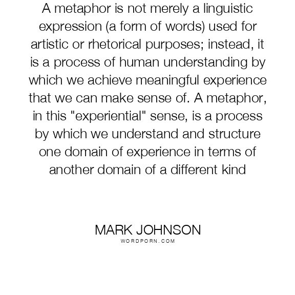A metaphor is not merely a linguistic expression (a form of words) used for artistic or rhetorical purposes; instead, it is a process of human understanding by which we achieve meaningful experience that we can make sense of. A metaphor, in this "experiential" sense, is a process by which we understand and structure one domain of experience in terms of another domain of a different kind