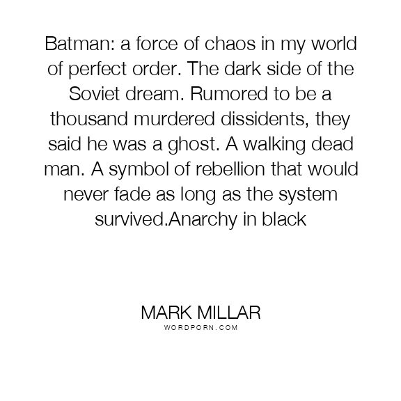 Batman: a force of chaos in my world of perfect order. The dark side of the Soviet dream. Rumored to be a thousand murdered dissidents, they said he was a ghost. A walking dead man. A symbol of rebellion that would never fade as long as the system survived.Anarchy in black