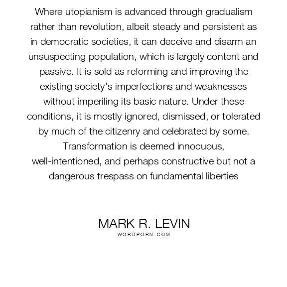 Where utopianism is advanced through gradualism rather than revolution, albeit steady and persistent as in democratic societies, it can deceive and disarm an unsuspecting population, which is largely content and passive. It is sold as reforming and improving the existing society's imperfections and weaknesses without imperiling its basic nature. Under these conditions, it is mostly ignored, dismissed, or tolerated by much of the citizenry and celebrated by some. Transformation is deemed innocuous, well-intentioned, and perhaps constructive but not a dangerous trespass on fundamental liberties