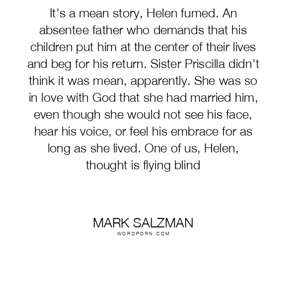 It's a mean story, Helen fumed. An absentee father who demands that his children put him at the center of their lives and beg for his return. Sister Priscilla didn't think it was mean, apparently. She was so in love with God that she had married him, even though she would not see his face, hear his voice, or feel his embrace for as long as she lived. One of us, Helen, thought is flying blind