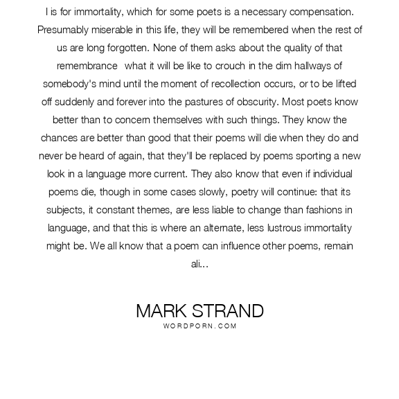 I is for immortality, which for some poets is a necessary compensation. Presumably miserable in this life, they will be remembered when the rest of us are long forgotten. None of them asks about the quality of that remembrance--what it will be like to crouch in the dim hallways of somebody's mind until the moment of recollection occurs, or to be lifted off suddenly and forever into the pastures of obscurity. Most poets know better than to concern themselves with such things. They know the chances are better than good that their poems will die when they do and never be heard of again, that they'll be replaced by poems sporting a new look in a language more current. They also know that even if individual poems die, though in some cases slowly, poetry will continue: that its subjects, it constant themes, are less liable to change than fashions in language, and that this is where an alternate, less lustrous immortality might be. We all know that a poem can influence other poems, remain alive in them, just as previous poems are alive in it. Could we not say, therefore, that individual poems succeed most by encouraging revisions of themselves and inducing their own erasure? Yes, but is this immortality, or simply a purposeful way of being dead?