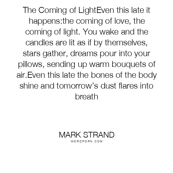 The Coming of LightEven this late it happens:the coming of love, the coming of light. You wake and the candles are lit as if by themselves, stars gather, dreams pour into your pillows, sending up warm bouquets of air.Even this late the bones of the body shine and tomorrow’s dust flares into breath