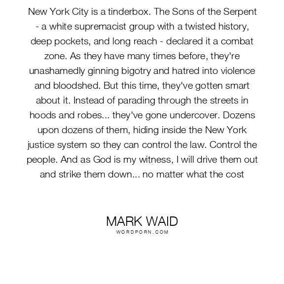 New York City is a tinderbox. The Sons of the Serpent - a white supremacist group with a twisted history, deep pockets, and long reach - declared it a combat zone. As they have many times before, they're unashamedly ginning bigotry and hatred into violence and bloodshed. But this time, they've gotten smart about it. Instead of parading through the streets in hoods and robes... they've gone undercover. Dozens upon dozens of them, hiding inside the New York justice system so they can control the law. Control the people. And as God is my witness, I will drive them out and strike them down... no matter what the cost
