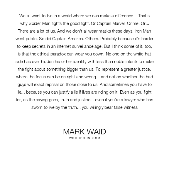 We all want to live in a world where we can make a difference... That's why Spider-Man fights the good fight. Or Captain Marvel. Or me. Or... There are a lot of us. And we don't all wear masks these days. Iron Man went public. So did Captain America. Others. Probably because it's harder to keep secrets in an internet surveillance age. But I think some of it, too, is that the ethical paradox can wear you down. No one on the white-hat side has ever hidden his or her identity with less than noble intent: to make the fight about something bigger than us. To represent a greater justice, where the focus can be on right and wrong... and not on whether the bad guys will exact reprisal on those close to us. And sometimes you have to lie... because you can justify a lie if lives are riding on it. Even as you fight for, as the saying goes, truth and justice... even if you're a lawyer who has sworn to live by the truth... you willingly bear false witness