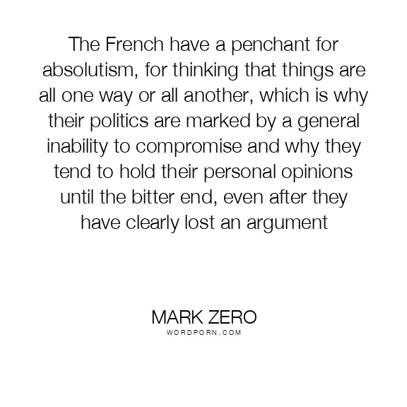 The French have a penchant for absolutism, for thinking that things are all one way or all another, which is why their politics are marked by a general inability to compromise and why they tend to hold their personal opinions until the bitter end, even after they have clearly lost an argument