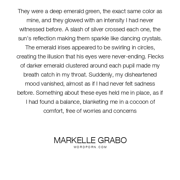 They were a deep emerald green, the exact same color as mine, and they glowed with an intensity I had never witnessed before. A slash of silver crossed each one, the sun's reflection making them sparkle like dancing crystals. The emerald irises appeared to be swirling in circles, creating the illusion that his eyes were never-ending. Flecks of darker emerald clustered around each pupil made my breath catch in my throat. Suddenly, my disheartened mood vanished, almost as if I had never felt sadness before. Something about these eyes held me in place, as if I had found a balance, blanketing me in a cocoon of comfort, free of worries and concerns