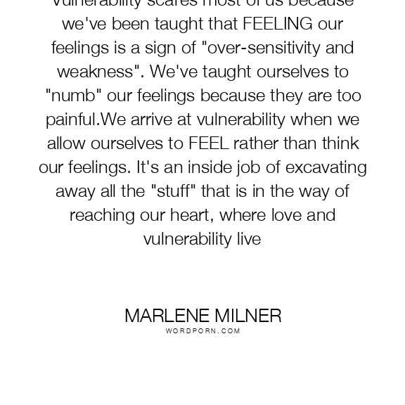Vulnerability scares most of us because we've been taught that FEELING our feelings is a sign of "over-sensitivity and weakness". We've taught ourselves to "numb" our feelings because they are too painful.We arrive at vulnerability when we allow ourselves to FEEL rather than think our feelings. It's an inside job of excavating away all the "stuff" that is in the way of reaching our heart, where love and vulnerability live