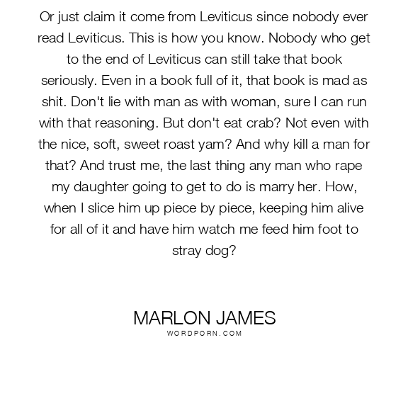 Or just claim it come from Leviticus since nobody ever read Leviticus. This is how you know. Nobody who get to the end of Leviticus can still take that book seriously. Even in a book full of it, that book is mad as shit. Don't lie with man as with woman, sure I can run with that reasoning. But don't eat crab? Not even with the nice, soft, sweet roast yam? And why kill a man for that? And trust me, the last thing any man who rape my daughter going to get to do is marry her. How, when I slice him up piece by piece, keeping him alive for all of it and have him watch me feed him foot to stray dog?