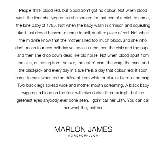 People think blood red, but blood don't got no colour. Not when blood wash the floor she lying on as she scream for that son of a bitch to come, the lone baby of 1785. Not when the baby wash in crimson and squealing like it just depart heaven to come to hell, another place of red. Not when the midwife know that the mother shed too much blood, and she who don't reach fourteen birthday yet speak curse 'pon the chile and the papa, and then she drop down dead like old horse. Not when blood spurt from the skin, on spring from the axe, the cat-o'-nine, the whip, the cane and the blackjack and every day in slave life is a day that colour red. It soon come to pass when red no different from white or blue or black or nothing. Two black legs spread wide and mother mouth screaming. A black baby wiggling in blood on the floor with skin darker than midnight but the greenest eyes anybody ever done seen. I goin' call her Lilith. You can call her what they call her