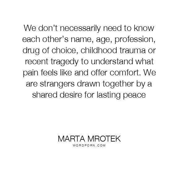 We don’t necessarily need to know each other’s name, age, profession, drug of choice, childhood trauma or recent tragedy to understand what pain feels like and offer comfort. We are strangers drawn together by a shared desire for lasting peace