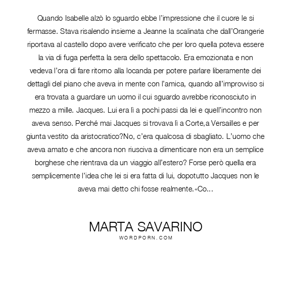 Quando Isabelle alzò lo sguardo ebbe l’impressione che il cuore le si fermasse. Stava risalendo insieme a Jeanne la scalinata che dall’Orangerie riportava al castello dopo avere verificato che per loro quella poteva essere la via di fuga perfetta la sera dello spettacolo. Era emozionata e non vedeva l’ora di fare ritorno alla locanda per potere parlare liberamente dei dettagli del piano che aveva in mente con l’amica, quando all’improvviso si era trovata a guardare un uomo il cui sguardo avrebbe riconosciuto in mezzo a mille. Jacques. Lui era lì a pochi passi da lei e quell’incontro non aveva senso. Perché mai Jacques si trovava lì a Corte,a Versailles e per giunta vestito da aristocratico?No, c’era qualcosa di sbagliato. L’uomo che aveva amato e che ancora non riusciva a dimenticare non era un semplice borghese che rientrava da un viaggio all’estero? Forse però quella era semplicemente l’idea che lei si era fatta di lui, dopotutto Jacques non le aveva mai detto chi fosse realmente.«Cosa c’è?» domandò Jeanne vedendo l’amica ancora immobile e visibilmente sconvolta. Poi alzò lo sguardo anche lei e vide quel giovane bellissimo e riccamente vestito che fissava l’amica. Se però a lei quel volto non diceva nulla, diversamente fu quando il suo sguardo si spostò sull’altro uomo che intanto aveva raggiunto Jacques e si era fermato accanto a lui. «Oh mio Dio» mormorò Jeanne.La situazione che si era creata aveva qualcosa di surreale. Isabelle, Jacques, Jeanne e Nicolas che si fissavano l’un l’altro lì, immobili su quella scalinata e con le prime fredde gocce di pioggia che cominciavano a cadere sui loro visi. Il rombo del tuono annunciò che il temporale era ormai arrivato. Sembrava che il tempo fosse congelato. Nessuno osava fare un gesto o pronunciare una parola.Infine fu Isabelle a parlare per prima.«Tu...qui?» riuscì a dire.Gli occhi azzurri di Jacques puntati in quelli verde smeraldo di lei. “Dio quanto è bella