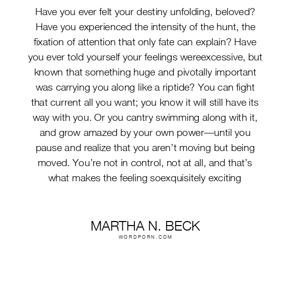 Have you ever felt your destiny unfolding, beloved? Have you experienced the intensity of the hunt, the fixation of attention that only fate can explain? Have you ever told yourself your feelings wereexcessive, but known that something huge and pivotally important was carrying you along like a riptide? You can fight that current all you want; you know it will still have its way with you. Or you cantry swimming along with it, and grow amazed by your own power—until you pause and realize that you aren’t moving but being moved. You’re not in control, not at all, and that’s what makes the feeling soexquisitely exciting