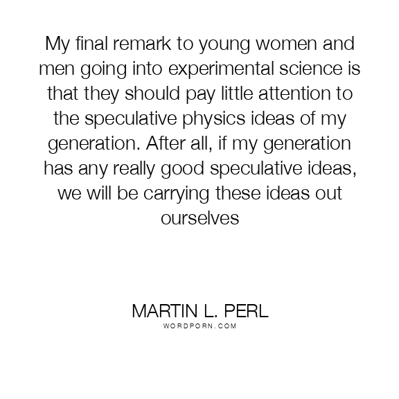 My final remark to young women and men going into experimental science is that they should pay little attention to the speculative physics ideas of my generation. After all, if my generation has any really good speculative ideas, we will be carrying these ideas out ourselves