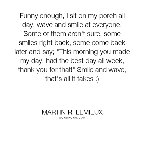 Martin R. Lemieux quote. Funny enough, I sit on my porch all day, wave and smile at everyone. Some of them aren't sure, some smiles right back, some come back later and say;