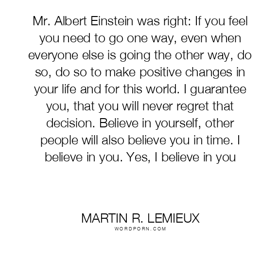 Martin R. Lemieux quote. Mr. Albert Einstein was right: If you feel you need to go one way, even when everyone else is going the other way, do so, do so to make positive changes in your life and for this world. I guarantee you, that you will never regret that decision. Believe in yourself, other people will also believe you in time. I believe in you. Yes, I believe in you