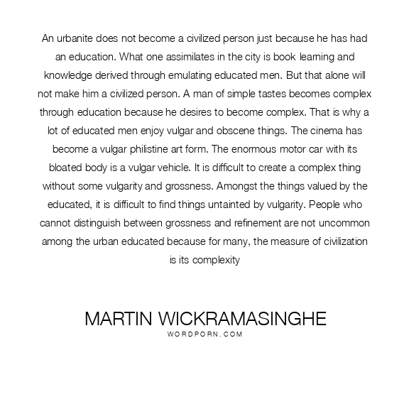 An urbanite does not become a civilized person just because he has had an education. What one assimilates in the city is book-learning and knowledge derived through emulating educated men. But that alone will not make him a civilized person. A man of simple tastes becomes complex through education because he desires to become complex. That is why a lot of educated men enjoy vulgar and obscene things. The cinema has become a vulgar philistine art form. The enormous motor car with its bloated body is a vulgar vehicle. It is difficult to create a complex thing without some vulgarity and grossness. Amongst the things valued by the educated, it is difficult to find things untainted by vulgarity. People who cannot distinguish between grossness and refinement are not uncommon among the urban educated because for many, the measure of civilization is its complexity