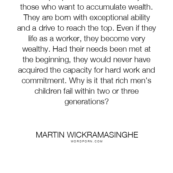 The few people who work earnestly are those who want to accumulate wealth. They are born with exceptional ability and a drive to reach the top. Even if they life as a worker, they become very wealthy. Had their needs been met at the beginning, they would never have acquired the capacity for hard work and commitment. Why is it that rich men's children fail within two or three generations?