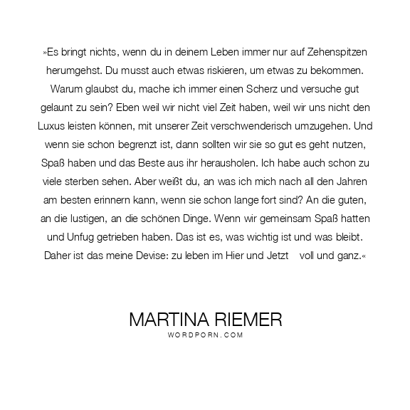 »Es bringt nichts, wenn du in deinem Leben immer nur auf Zehenspitzen herumgehst. Du musst auch etwas riskieren, um etwas zu bekommen. Warum glaubst du, mache ich immer einen Scherz und versuche gut gelaunt zu sein? Eben weil wir nicht viel Zeit haben, weil wir uns nicht den Luxus leisten können, mit unserer Zeit verschwenderisch umzugehen. Und wenn sie schon begrenzt ist, dann sollten wir sie so gut es geht nutzen, Spaß haben und das Beste aus ihr herausholen. Ich habe auch schon zu viele sterben sehen. Aber weißt du, an was ich mich nach all den Jahren am besten erinnern kann, wenn sie schon lange fort sind? An die guten, an die lustigen, an die schönen Dinge. Wenn wir gemeinsam Spaß hatten und Unfug getrieben haben. Das ist es, was wichtig ist und was bleibt. Daher ist das meine Devise: zu leben im Hier und Jetzt – voll und ganz.«