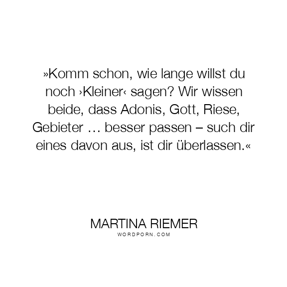 »Komm schon, wie lange willst du noch ›Kleiner‹ sagen? Wir wissen beide, dass Adonis, Gott, Riese, Gebieter … besser passen – such dir eines davon aus, ist dir überlassen.«