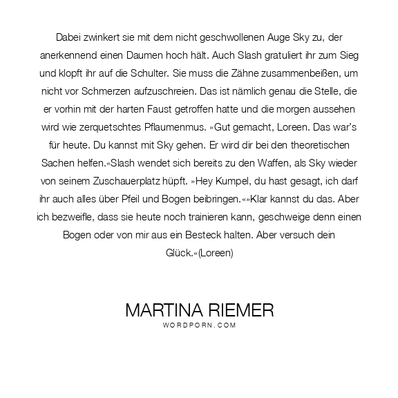 Dabei zwinkert sie mit dem nicht geschwollenen Auge Sky zu, der anerkennend einen Daumen hoch hält. Auch Slash gratuliert ihr zum Sieg und klopft ihr auf die Schulter. Sie muss die Zähne zusammenbeißen, um nicht vor Schmerzen aufzuschreien. Das ist nämlich genau die Stelle, die er vorhin mit der harten Faust getroffen hatte und die morgen aussehen wird wie zerquetschtes Pflaumenmus. »Gut gemacht, Loreen. Das war’s für heute. Du kannst mit Sky gehen. Er wird dir bei den theoretischen Sachen helfen.«Slash wendet sich bereits zu den Waffen, als Sky wieder von seinem Zuschauerplatz hüpft. »Hey Kumpel, du hast gesagt, ich darf ihr auch alles über Pfeil und Bogen beibringen.«»Klar kannst du das. Aber ich bezweifle, dass sie heute noch trainieren kann, geschweige denn einen Bogen oder von mir aus ein Besteck halten. Aber versuch dein Glück.«(Loreen)