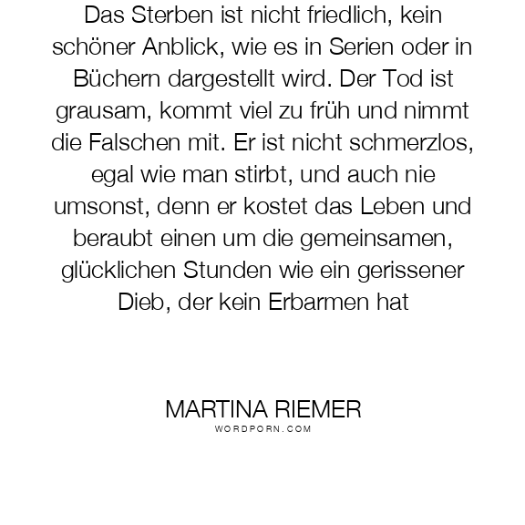 Das Sterben ist nicht friedlich, kein schöner Anblick, wie es in Serien oder in Büchern dargestellt wird. Der Tod ist grausam, kommt viel zu früh und nimmt die Falschen mit. Er ist nicht schmerzlos, egal wie man stirbt, und auch nie umsonst, denn er kostet das Leben und beraubt einen um die gemeinsamen, glücklichen Stunden wie ein gerissener Dieb, der kein Erbarmen hat