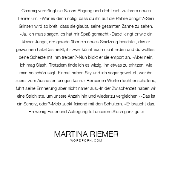 Grimmig verdrängt sie Slashs Abgang und dreht sich zu ihrem neuen Lehrer um. »War es denn nötig, dass du ihn auf die Palme bringst?«Sein Grinsen wird so breit, dass sie glaubt, seine gesamten Zähne zu sehen. »Ja. Ich muss sagen, es hat mir Spaß gemacht.«Dabei klingt er wie ein kleiner Junge, der gerade über ein neues Spielzeug berichtet, das er gewonnen hat.»Das heißt, ihr zwei könnt euch nicht leiden und du wolltest deine Scherze mit ihm treiben?«Nun blickt er sie empört an. »Aber nein, ich mag Slash. Trotzdem finde ich es witzig, ihn etwas zu erhitzen, wie man so schön sagt. Einmal haben Sky und ich sogar gewettet, wer ihn zuerst zum Ausrasten bringen kann.« Bei seinen Worten lacht er schallend, führt seine Erinnerung aber nicht näher aus.»In der Zwischenzeit haben wir eine Strichliste, um unsere Anzahl hin und wieder zu vergleichen.«»Das ist ein Scherz, oder?«Melo zuckt feixend mit den Schultern. »Er braucht das. Ein wenig Feuer und Aufregung tut unserem Slash ganz gut.«