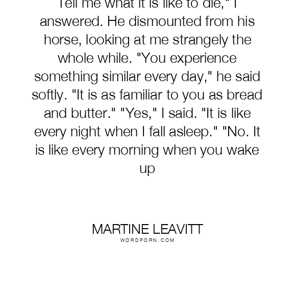 Tell me what it is like to die," I answered. He dismounted from his horse, looking at me strangely the whole while. "You experience something similar every day," he said softly. "It is as familiar to you as bread and butter." "Yes," I said. "It is like every night when I fall asleep." "No. It is like every morning when you wake up