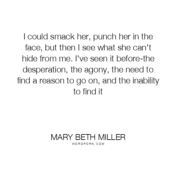I could smack her, punch her in the face, but then I see what she can't hide from me. I've seen it before-the desperation, the agony, the need to find a reason to go on, and the inability to find it