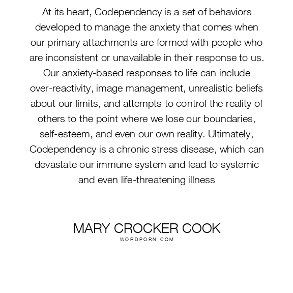 At its heart, Codependency is a set of behaviors developed to manage the anxiety that comes when our primary attachments are formed with people who are inconsistent or unavailable in their response to us. Our anxiety-based responses to life can include over-reactivity, image management, unrealistic beliefs about our limits, and attempts to control the reality of others to the point where we lose our boundaries, self-esteem, and even our own reality. Ultimately, Codependency is a chronic stress disease, which can devastate our immune system and lead to systemic and even life-threatening illness
