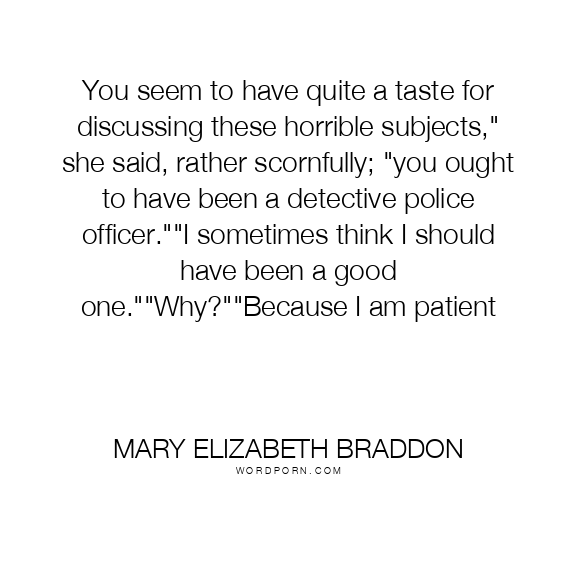 You seem to have quite a taste for discussing these horrible subjects," she said, rather scornfully; "you ought to have been a detective police officer.""I sometimes think I should have been a good one.""Why?""Because I am patient