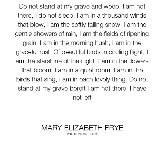 Do not stand at my grave and weep, I am not there, I do not sleep. I am in a thousand winds that blow, I am the softly falling snow. I am the gentle showers of rain, I am the fields of ripening grain. I am in the morning hush, I am in the graceful rush Of beautiful birds in circling flight, I am the starshine of the night. I am in the flowers that bloom, I am in a quiet room. I am in the birds that sing, I am in each lovely thing. Do not stand at my grave bereft I am not there. I have not left