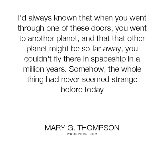 I'd always known that when you went through one of these doors, you went to another planet, and that that other planet might be so far away, you couldn't fly there in spaceship in a million years. Somehow, the whole thing had never seemed strange before today