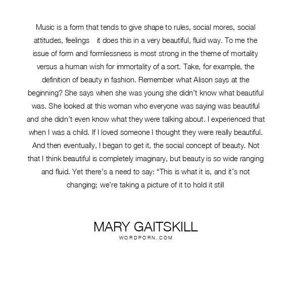 Music is a form that tends to give shape to rules, social mores, social attitudes, feelings—it does this in a very beautiful, fluid way. To me the issue of form and formlessness is most strong in the theme of mortality versus a human wish for immortality of a sort. Take, for example, the definition of beauty in fashion. Remember what Alison says at the beginning? She says when she was young she didn’t know what beautiful was. She looked at this woman who everyone was saying was beautiful and she didn’t even know what they were talking about. I experienced that when I was a child. If I loved someone I thought they were really beautiful. And then eventually, I began to get it, the social concept of beauty. Not that I think beautiful is completely imaginary, but beauty is so wide ranging and fluid. Yet there’s a need to say: “This is what it is, and it’s not changing; we’re taking a picture of it to hold it still