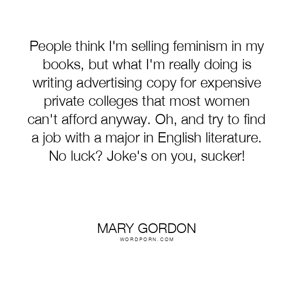 People think I'm selling feminism in my books, but what I'm really doing is writing advertising copy for expensive private colleges that most women can't afford anyway. Oh, and try to find a job with a major in English literature. No luck? Joke's on you, sucker!