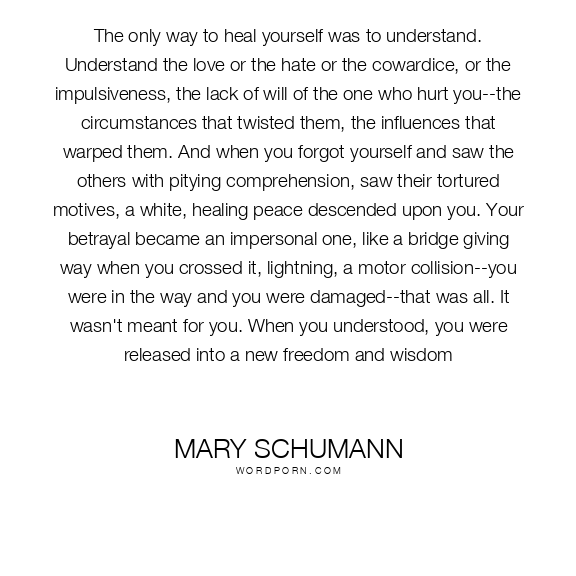 The only way to heal yourself was to understand. Understand the love or the hate or the cowardice, or the impulsiveness, the lack of will of the one who hurt you--the circumstances that twisted them, the influences that warped them. And when you forgot yourself and saw the others with pitying comprehension, saw their tortured motives, a white, healing peace descended upon you. Your betrayal became an impersonal one, like a bridge giving way when you crossed it, lightning, a motor collision--you were in the way and you were damaged--that was all. It wasn't meant for you. When you understood, you were released into a new freedom and wisdom