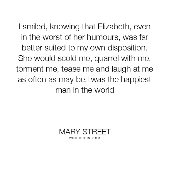 I smiled, knowing that Elizabeth, even in the worst of her humours, was far better suited to my own disposition. She would scold me, quarrel with me, torment me, tease me and laugh at me as often as may be.I was the happiest man in the world