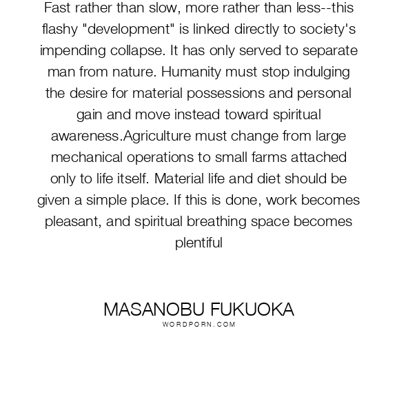 Fast rather than slow, more rather than less--this flashy "development" is linked directly to society's impending collapse. It has only served to separate man from nature. Humanity must stop indulging the desire for material possessions and personal gain and move instead toward spiritual awareness.Agriculture must change from large mechanical operations to small farms attached only to life itself. Material life and diet should be given a simple place. If this is done, work becomes pleasant, and spiritual breathing space becomes plentiful