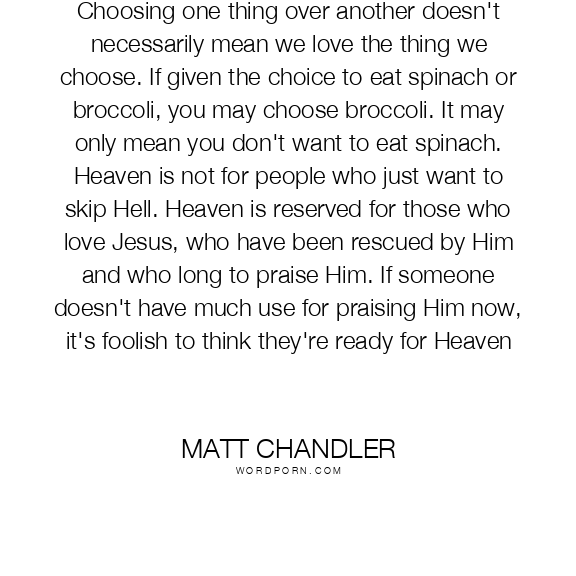 Choosing one thing over another doesn't necessarily mean we love the thing we choose. If given the choice to eat spinach or broccoli, you may choose broccoli. It may only mean you don't want to eat spinach. Heaven is not for people who just want to skip Hell. Heaven is reserved for those who love Jesus, who have been rescued by Him and who long to praise Him. If someone doesn't have much use for praising Him now, it's foolish to think they're ready for Heaven