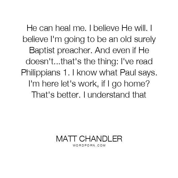 He can heal me. I believe He will. I believe I'm going to be an old surely Baptist preacher. And even if He doesn't...that's the thing: I've read Philippians 1. I know what Paul says. I'm here let's work, if I go home? That's better. I understand that