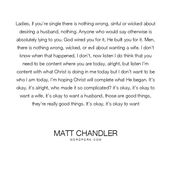 Ladies, if you’re single there is nothing wrong, sinful or wicked about desiring a husband, nothing. Anyone who would say otherwise is absolutely lying to you. God wired you for it, He built you for it. Men, there is nothing wrong, wicked, or evil about wanting a wife. I don’t know when that happened, I don’t, now listen I do think that you need to be content where you are today, alright, but listen I’m content with what Christ is doing in me today but I don’t want to be who I am today, I’m hoping Christ will complete what He began. It’s okay, it’s alright, who made it so complicated? it’s okay, it’s okay to want a wife, it’s okay to want a husband, those are good things, they’re really good things. It’s okay, it’s okay to want