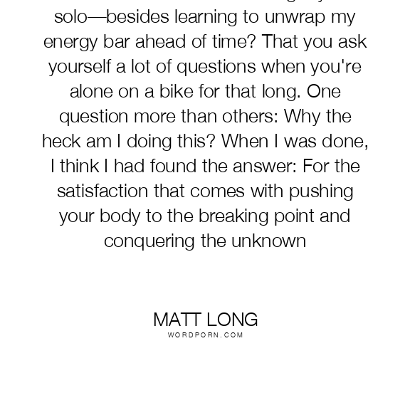 What did I discover during my solo—besides learning to unwrap my energy bar ahead of time? That you ask yourself a lot of questions when you're alone on a bike for that long. One question more than others: Why the heck am I doing this? When I was done, I think I had found the answer: For the satisfaction that comes with pushing your body to the breaking point and conquering the unknown