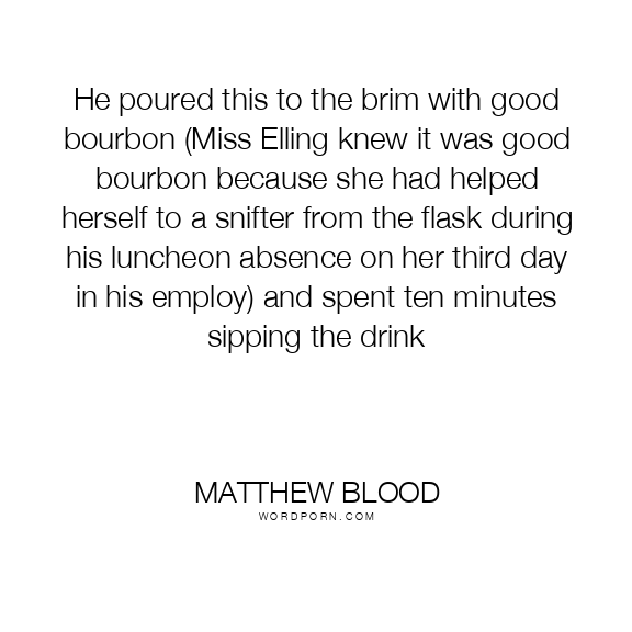 He poured this to the brim with good bourbon (Miss Elling knew it was good bourbon because she had helped herself to a snifter from the flask during his luncheon absence on her third day in his employ) and spent ten minutes sipping the drink