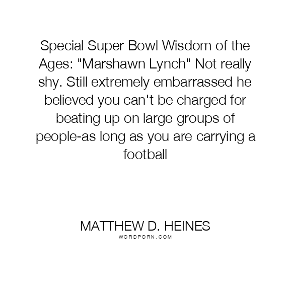 Special Super Bowl Wisdom of the Ages: "Marshawn Lynch" Not really shy. Still extremely embarrassed he believed you can't be charged for beating up on large groups of people-as long as you are carrying a football