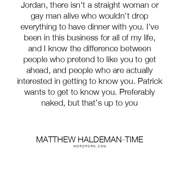 Jordan, there isn't a straight woman or gay man alive who wouldn't drop everything to have dinner with you. I've been in this business for all of my life, and I know the difference between people who pretend to like you to get ahead, and people who are actually interested in getting to know you. Patrick wants to get to know you. Preferably naked, but that’s up to you