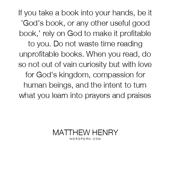If you take a book into your hands, be it 'God's book, or any other useful good book,' rely on God to make it profitable to you. Do not waste time reading unprofitable books. When you read, do so not out of vain curiosity but with love for God's kingdom, compassion for human beings, and the intent to turn what you learn into prayers and praises