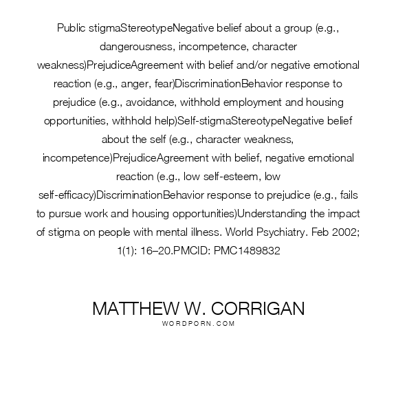 Public stigmaStereotypeNegative belief about a group (e.g., dangerousness, incompetence, character weakness)PrejudiceAgreement with belief and/or negative emotional reaction (e.g., anger, fear)DiscriminationBehavior response to prejudice (e.g., avoidance, withhold employment and housing opportunities, withhold help)Self-stigmaStereotypeNegative belief about the self (e.g., character weakness, incompetence)PrejudiceAgreement with belief, negative emotional reaction (e.g., low self-esteem, low self-efficacy)DiscriminationBehavior response to prejudice (e.g., fails to pursue work and housing opportunities)Understanding the impact of stigma on people with mental illness. World Psychiatry. Feb 2002; 1(1): 16–20.PMCID: PMC1489832