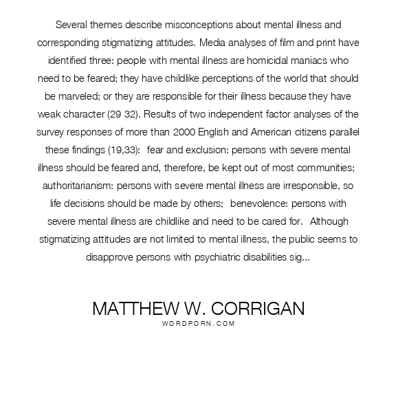 Several themes describe misconceptions about mental illness and corresponding stigmatizing attitudes. Media analyses of film and print have identified three: people with mental illness are homicidal maniacs who need to be feared; they have childlike perceptions of the world that should be marveled; or they are responsible for their illness because they have weak character (29-32). Results of two independent factor analyses of the survey responses of more than 2000 English and American citizens parallel these findings (19,33):- fear and exclusion: persons with severe mental illness should be feared and, therefore, be kept out of most communities;- authoritarianism: persons with severe mental illness are irresponsible, so life decisions should be made by others;- benevolence: persons with severe mental illness are childlike and need to be cared for.- Although stigmatizing attitudes are not limited to mental illness, the public seems to disapprove persons with psychiatric disabilities significantly more than persons with related conditions such as physical illness (34-36)