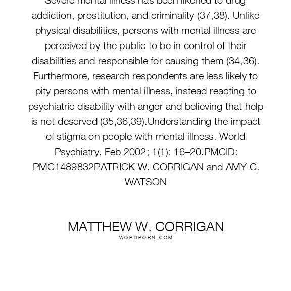 Severe mental illness has been likened to drug addiction, prostitution, and criminality (37,38). Unlike physical disabilities, persons with mental illness are perceived by the public to be in control of their disabilities and responsible for causing them (34,36). Furthermore, research respondents are less likely to pity persons with mental illness, instead reacting to psychiatric disability with anger and believing that help is not deserved (35,36,39).Understanding the impact of stigma on people with mental illness. World Psychiatry. Feb 2002; 1(1): 16–20.PMCID: PMC1489832PATRICK W. CORRIGAN and AMY C. WATSON
