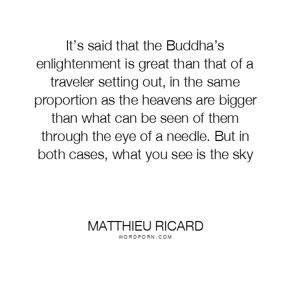 It’s said that the Buddha’s enlightenment is great than that of a traveler setting out, in the same proportion as the heavens are bigger than what can be seen of them through the eye of a needle. But in both cases, what you see is the sky