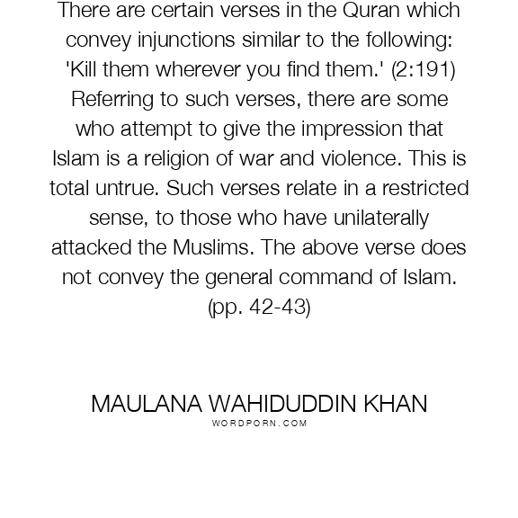 There are certain verses in the Quran which convey injunctions similar to the following: 'Kill them wherever you find them.' (2:191) Referring to such verses, there are some who attempt to give the impression that Islam is a religion of war and violence. This is total untrue. Such verses relate in a restricted sense, to those who have unilaterally attacked the Muslims. The above verse does not convey the general command of Islam. (pp. 42-43)